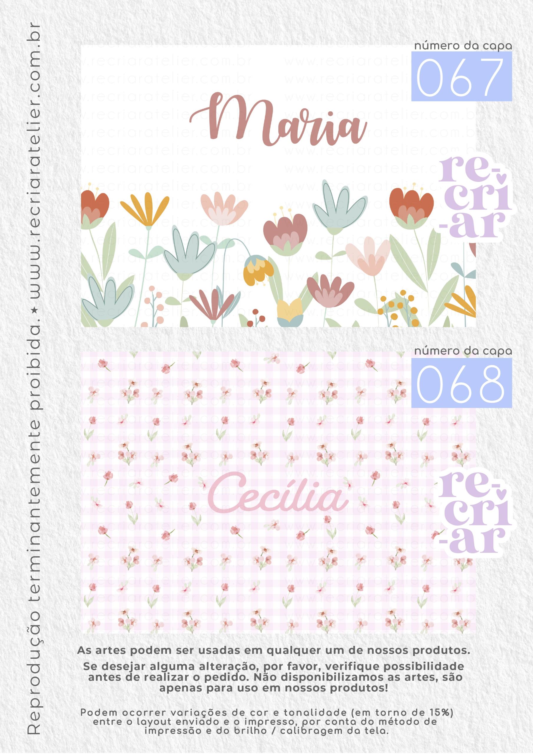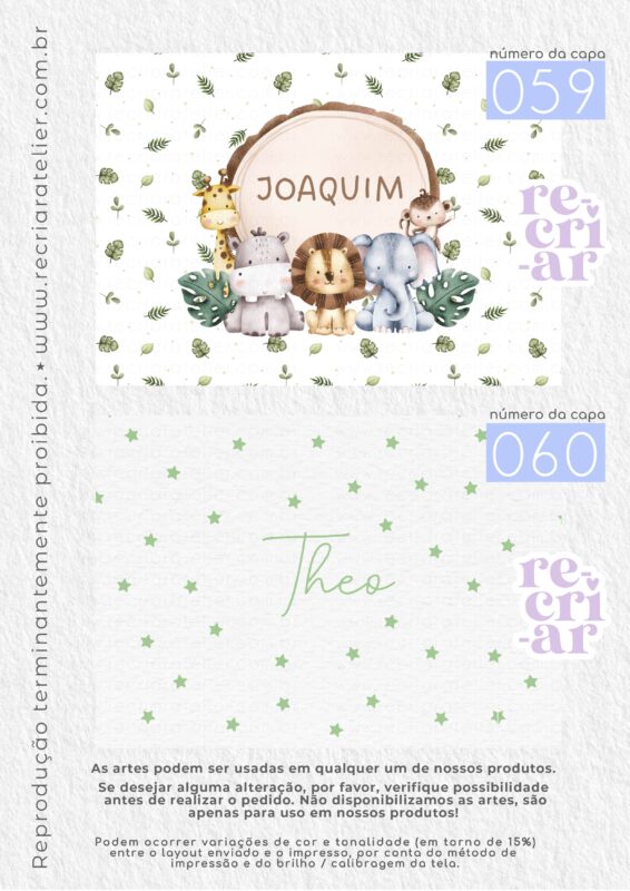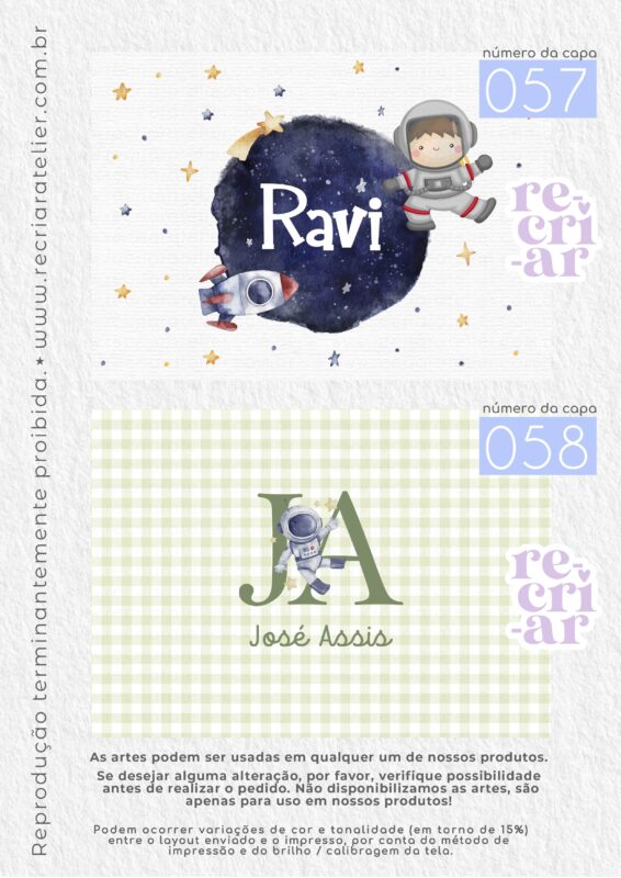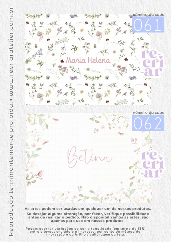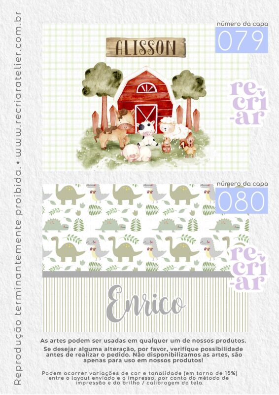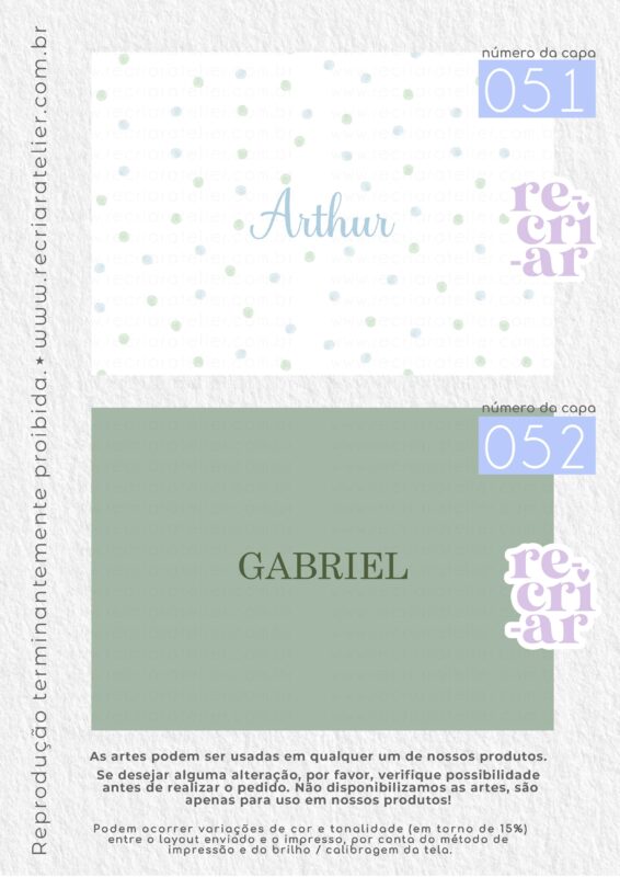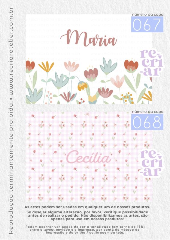 ● Se você desejar a arte de outra forma, outra opção que não esteja no nosso mostruário, criamos, sem custo adicional, desde que: esteja dentro das nossas possibilidades de criação; a arte não seja cópia de outra empresa; não seja um tema licenciado (disney, turma da mônica, heróis…); não seja uma capa com impressão chapada (impressões em cor única, toda preta, azul escuro, vermelho, etc.). Solicitamos apenas que consultem a possibilidade de criação antes da realização do pedido.