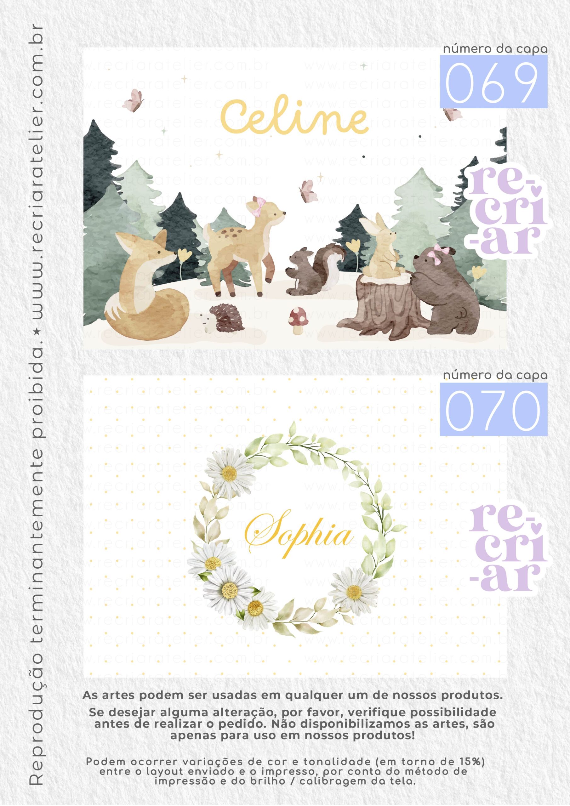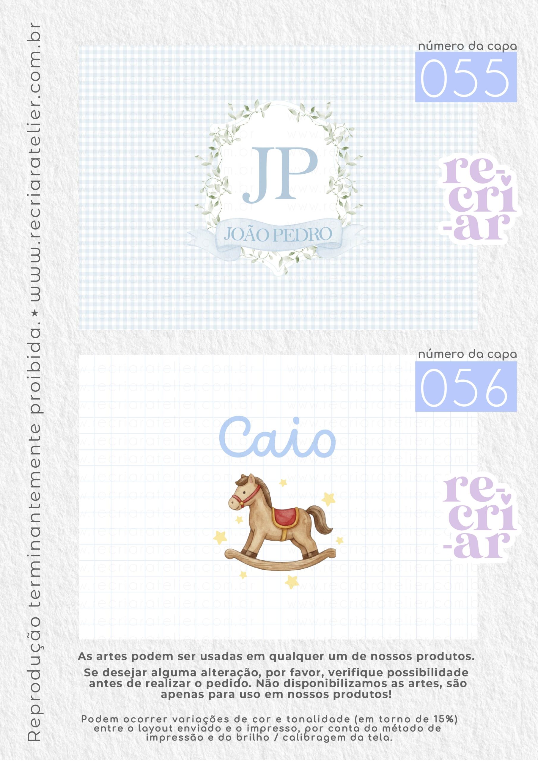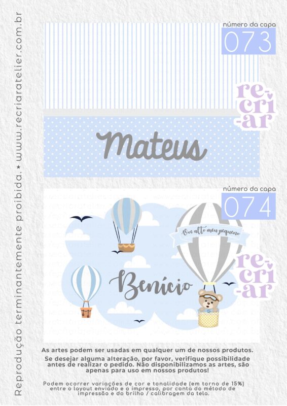 ● Se você desejar a arte de outra forma, outra opção que não esteja no nosso mostruário, criamos, sem custo adicional, desde que: esteja dentro das nossas possibilidades de criação; a arte não seja cópia de outra empresa; não seja um tema licenciado (disney, turma da mônica, heróis…); não seja uma capa com impressão chapada (impressões em cor única, toda preta, azul escuro, vermelho, etc.). Solicitamos apenas que consultem a possibilidade de criação antes da realização do pedido.