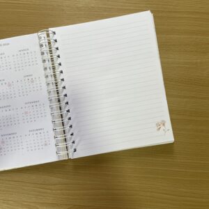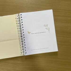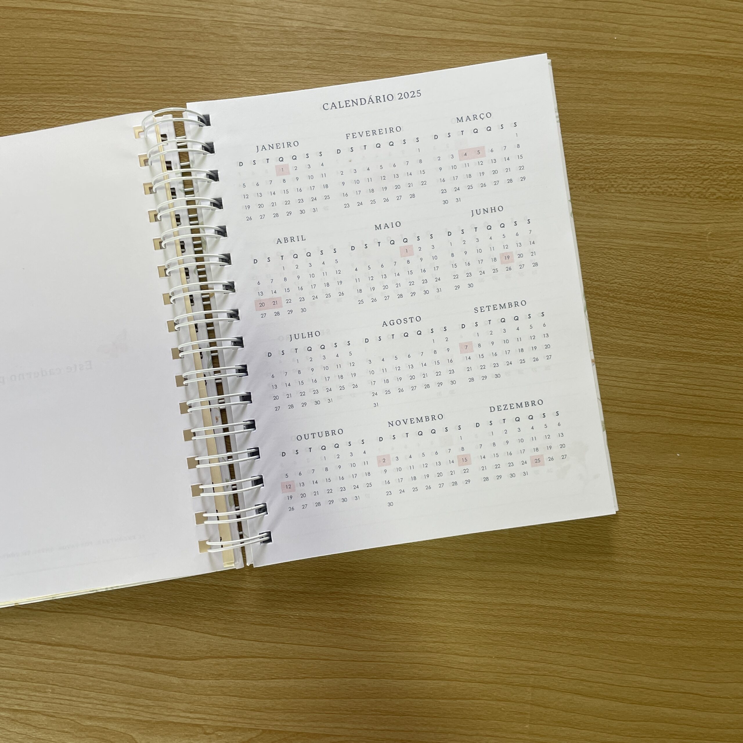 • Páginas: 120 folhas / 240 páginas pautadas com ilustração de flor no rodapé + calendário 2025/2026 + página inicial